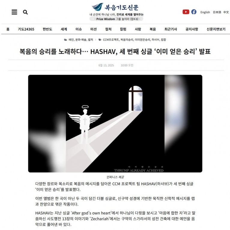 [기사] 복음의 승리를 노래하다… HASHAV, 세 번째 싱글 ‘이미 얻은 승리’ 발표(복음기도신문)