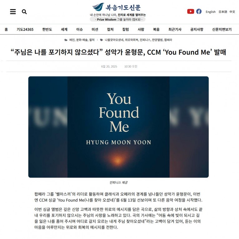[기사] “주님은 나를 포기하지 않으셨다” 성악가 윤형문, CCM ‘You Found Me’ 발매(복음기도신문)