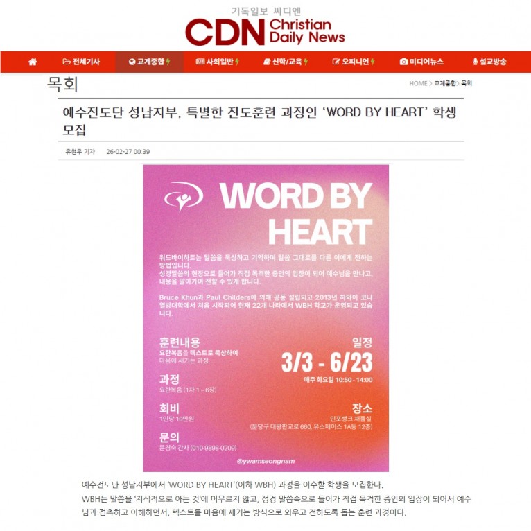 [기사] 예수전도단 성남지부, 특별한 전도훈련 과정인 ‘WORD BY HEART’ 학생 모집(기독일보 씨디엔)