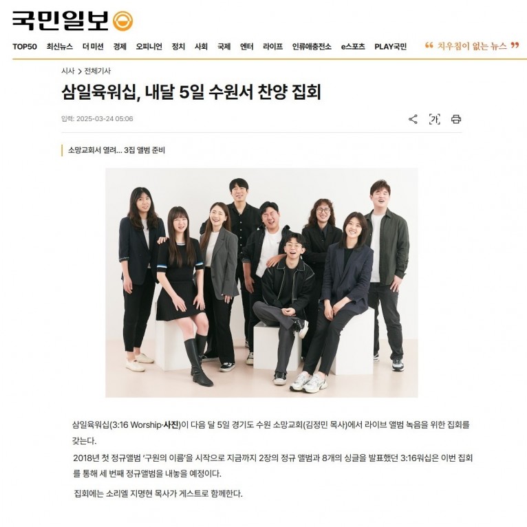 뮤직타임 [기사] 삼일육워십, 내달 5일 수원서 찬양 집회(국민일보)