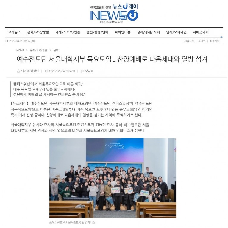 [기사] 예수전도단 서울대학지부 목요모임 ... 찬양예배로 다음세대와 열방 섬겨(뉴스제이)