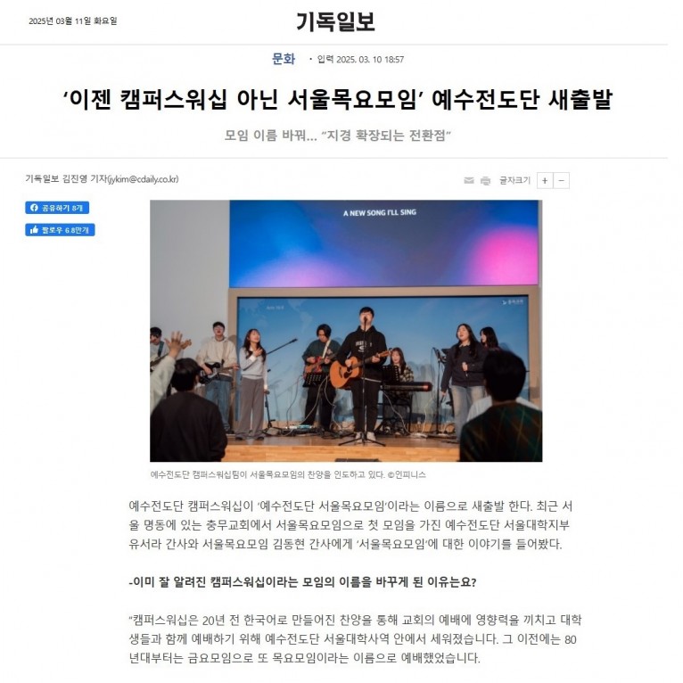 [기사] ‘이젠 캠퍼스워십 아닌 서울목요모임’ 예수전도단 새출발(기독일보)