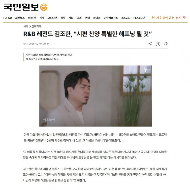 뮤직타임 [기사] R&B 레전드 김조한, “시편 찬양 특별한 해프닝 될 것”(국민일보)