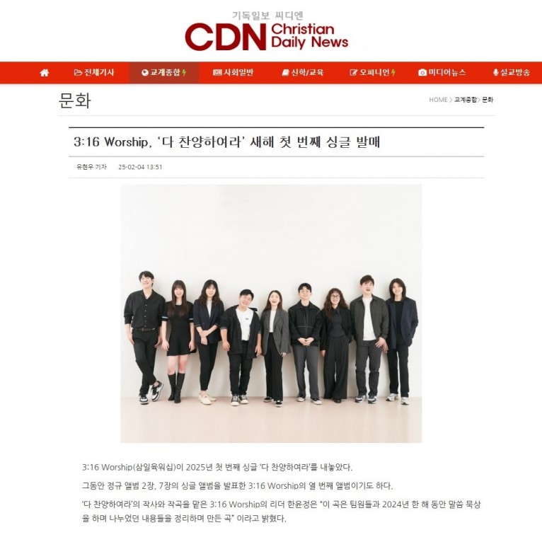 뮤직타임 [기사] 3:16 Worship, ‘다 찬양하여라’ 새해 첫 번째 싱글 발매(기독일보 씨디엔)