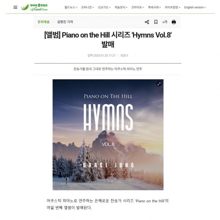 [기사] Piano on the Hill 시리즈 'Hymns Vol.8' 발매(라이프굿타임즈)