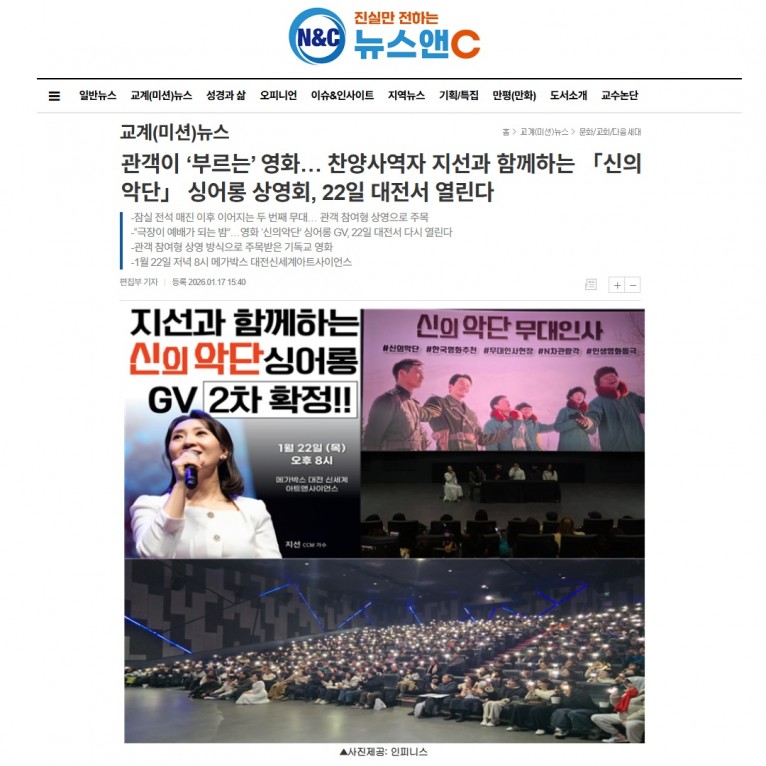 [기사] 관객이 ‘부르는’ 영화… 찬양사역자 지선과 함께하는 「신의 악단」 싱어롱 상영회, 22일 대전서 열린다(뉴스앤C)