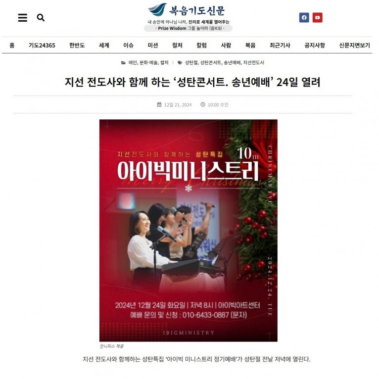 [기사] 지선 전도사와 함께 하는 ‘성탄콘서트. 송년예배’ 24일 열려(복음기도신문)