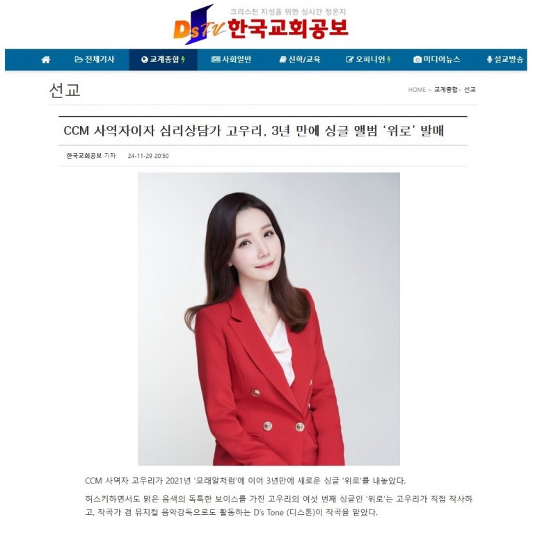 [기사] CCM 사역자이자 심리상담가 고우리, 3년 만에 싱글 앨범 ‘위로’ 발매(한국교회공보)