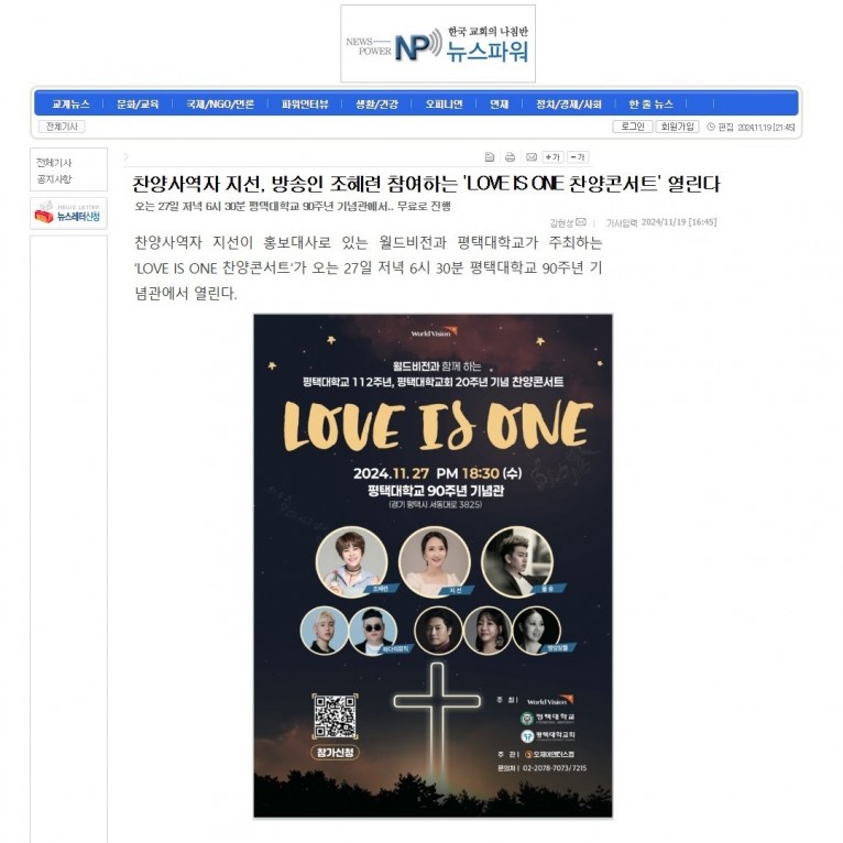 [기사] 찬양사역자 지선, 방송인 조혜련 참여하는 'LOVE IS ONE 찬양콘서트' 열린다(뉴스파워)