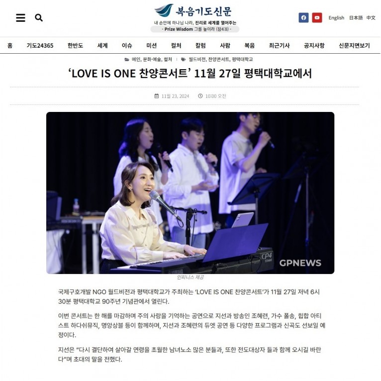 [기사] ‘LOVE IS ONE 찬양콘서트’ 11월 27일 평택대학교에서(복음기도신문)