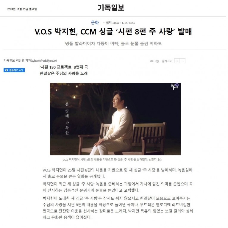 뮤직타임 [기사] V.O.S 박지헌, CCM 싱글 ‘시편 8편 주 사랑’ 발매(기독일보)