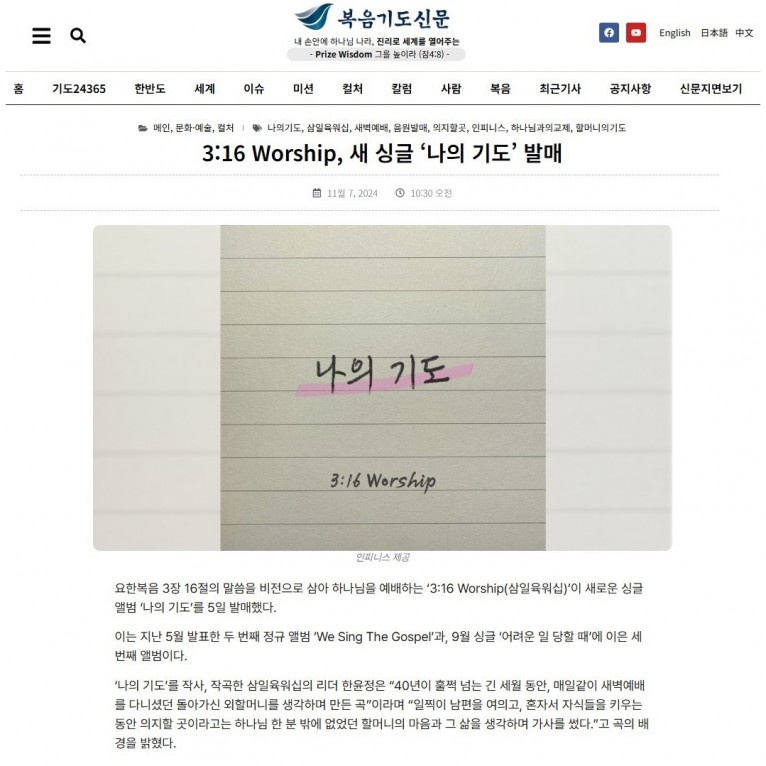 뮤직타임 [기사] 3:16 Worship, 새 싱글 ‘나의 기도’ 발매(복음기도신문)