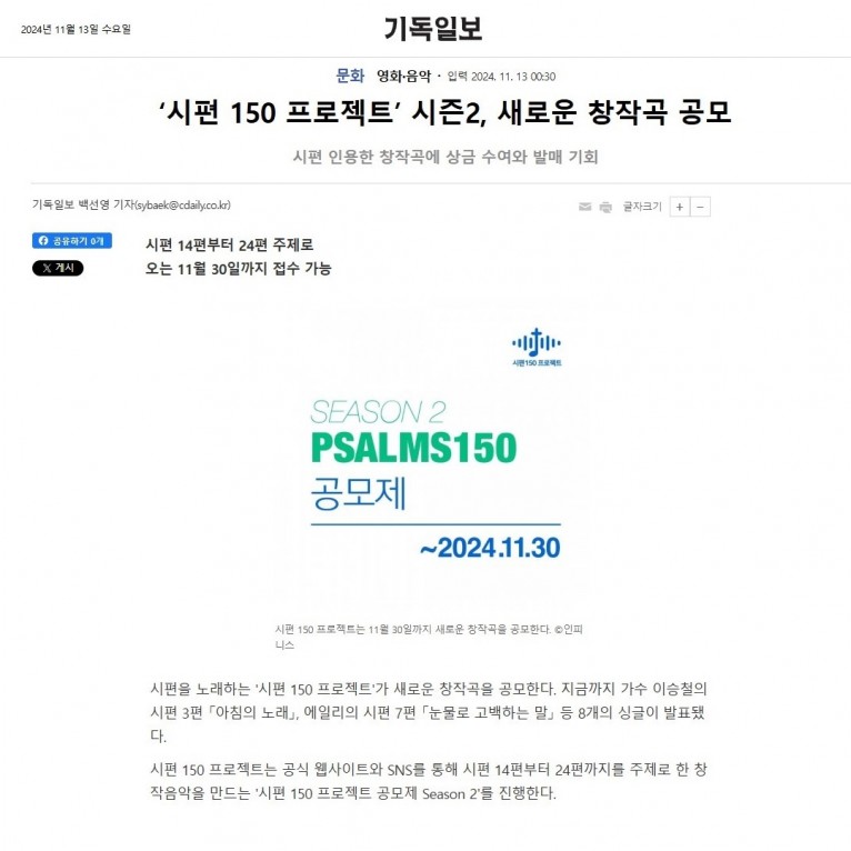 [기사] ‘시편 150 프로젝트’ 시즌2, 새로운 창작곡 공모(기독일보)