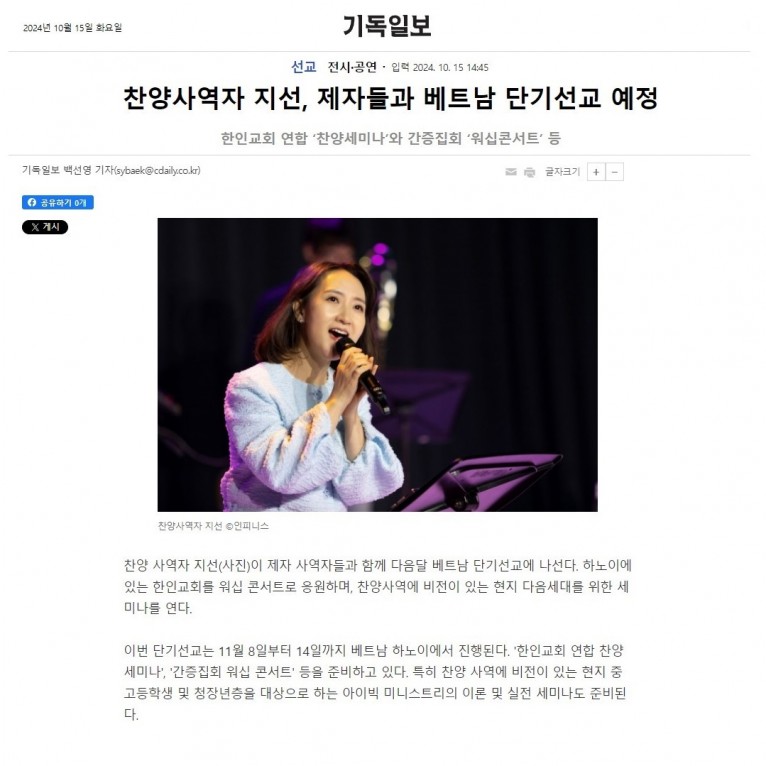 [기사] 찬양사역자 지선, 제자들과 베트남 단기선교 예정(기독일보)