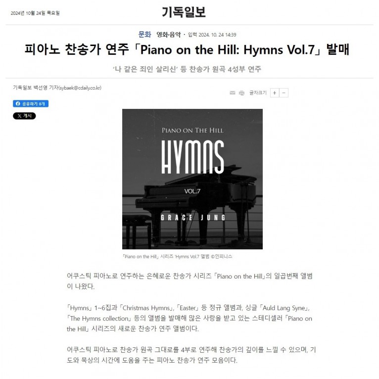 [기사] 피아노 찬송가 연주 「Piano on the Hill Hymns Vol.7」 발매(기독일보)