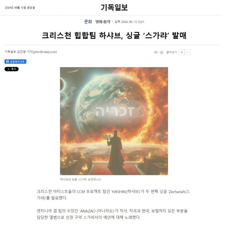 [기사] 크리스천 힙합팀 하샤브, 싱글 ‘스가랴’ 발매(기독일보)