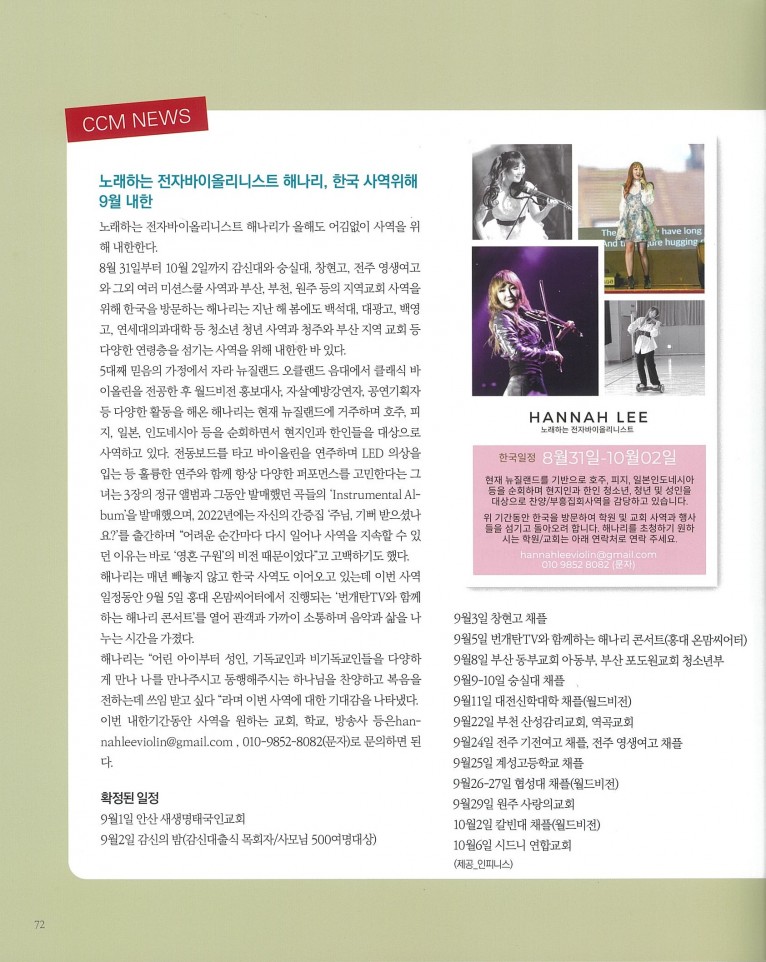 뮤직타임 [잡지] CCM News_ 노래하는 전자바이올리니스트 해나리, 한국 사역위해 9월 내한 (월간 Church Media 2024…