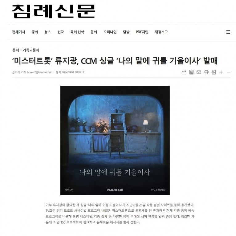 [기사] ‘미스터트롯’ 류지광, CCM 싱글 ‘나의 말에 귀를 기울이사’ 발매(침례신문)