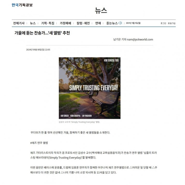 재즈 기타리스트이자 작곡가 겸 프로듀서인 김성수 교수(백석예대 교회실용음악과)가 찬송가 연주 앨범 '심플리 트러스팅 에브리데이(Simply Trusting Everyday)'를 발매했다.