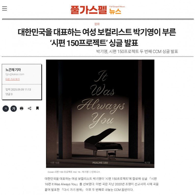 [기사] 대한민국을 대표하는 여성 보컬리스트 박기영이 부른 ‘시편 150프로젝트’ 싱글 발표(풀가스펠뉴스)
