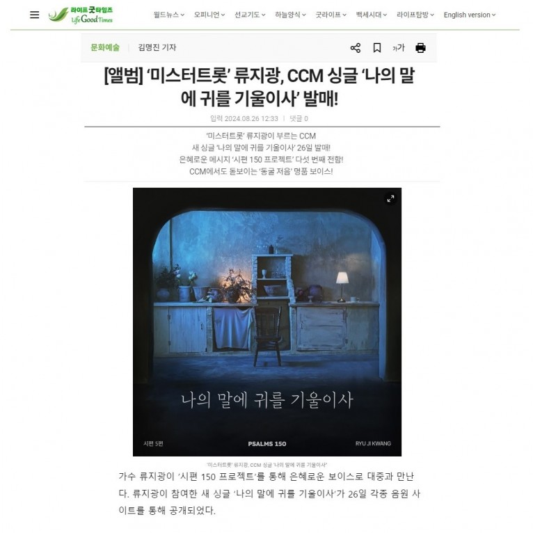 뮤직타임 [기사] ‘미스터트롯’ 류지광, CCM 싱글 ‘나의 말에 귀를 기울이사’ 발매!(라이프굿타임즈)