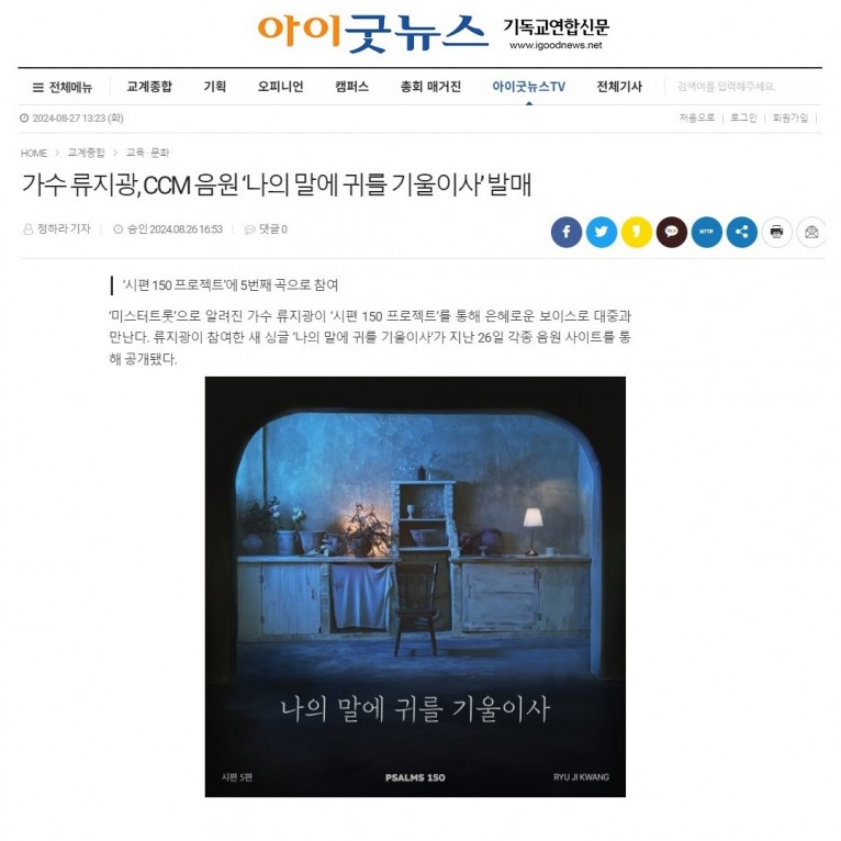 뮤직타임 [기사] 가수 류지광, CCM 음원 ‘나의 말에 귀를 기울이사’ 발매(기독교연합신문)