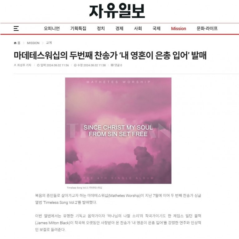 [기사] 마데테스워십의 두번째 찬송가 ‘내 영혼이 은총 입어’ 발매(자유일보)
