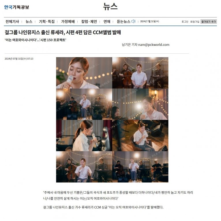 뮤직타임 [기사] 걸그룹 나인뮤지스 출신 류세라, 시편 4편 담은 CCM앨범 발매(한국기독공보)