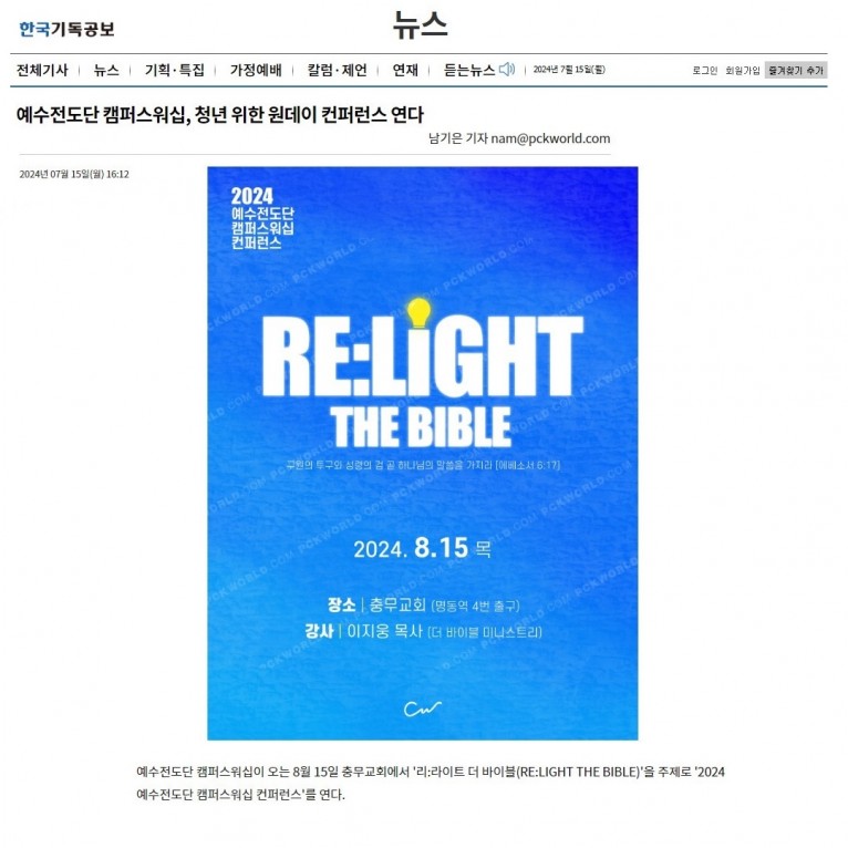 [기사] 예수전도단 캠퍼스워십, 청년 위한 원데이 컨퍼런스 연다(한국기독공보)