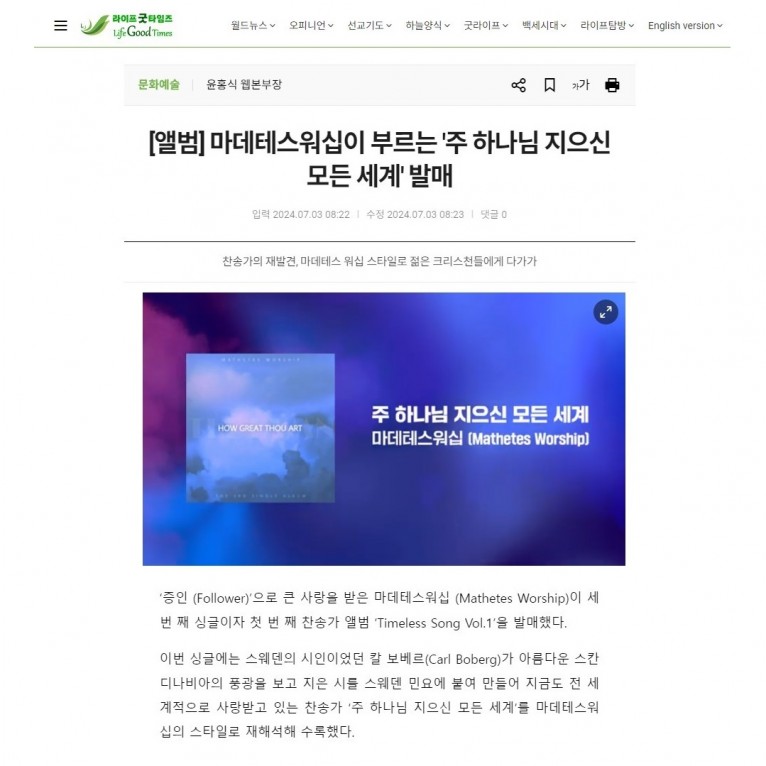 [기사] 마데테스워십이 부르는 '주 하나님 지으신 모든 세계' 발매(라이프굿타임즈)