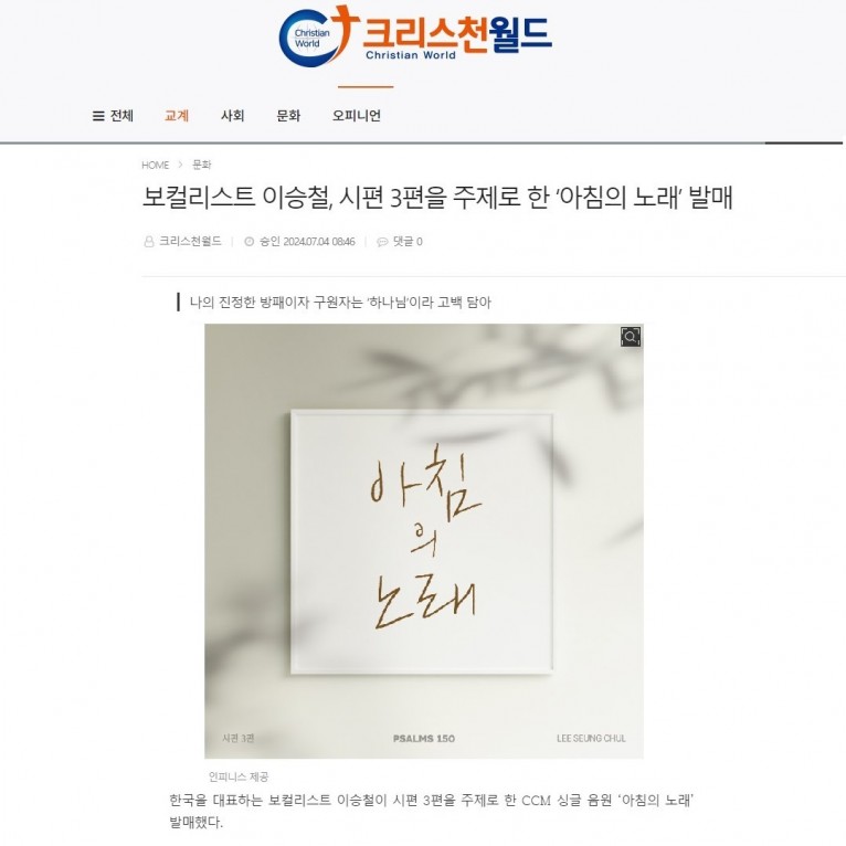 뮤직타임 [기사] 보컬리스트 이승철, 시편 3편을 주제로 한 ‘아침의 노래’ 발매(크리스천월드)