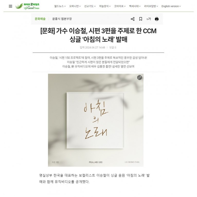 [기사] 가수 이승철, 시편 3편을 주제로 한 CCM 싱글 ‘아침의 노래’ 발매(라이프굿타임즈)