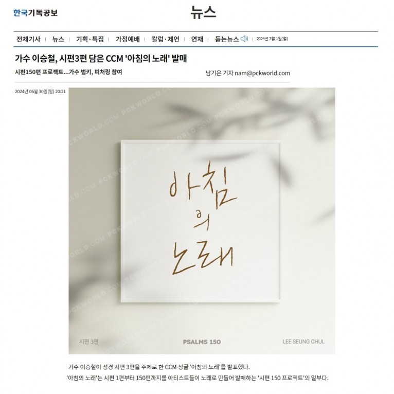 [기사] 가수 이승철, 시편3편 담은 CCM '아침의 노래' 발매(한국기독공보)