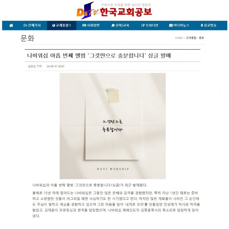 뮤직타임 [기사] 나비워십 아홉 번째 앨범 ‘그것만으로 충분합니다’ 싱글 발매(한국교회공보)