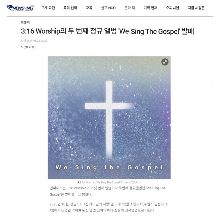 [기사] 3:16 Worship의 두 번째 정규 앨범 'We Sing The Gospel' 발매(뉴스앤넷)