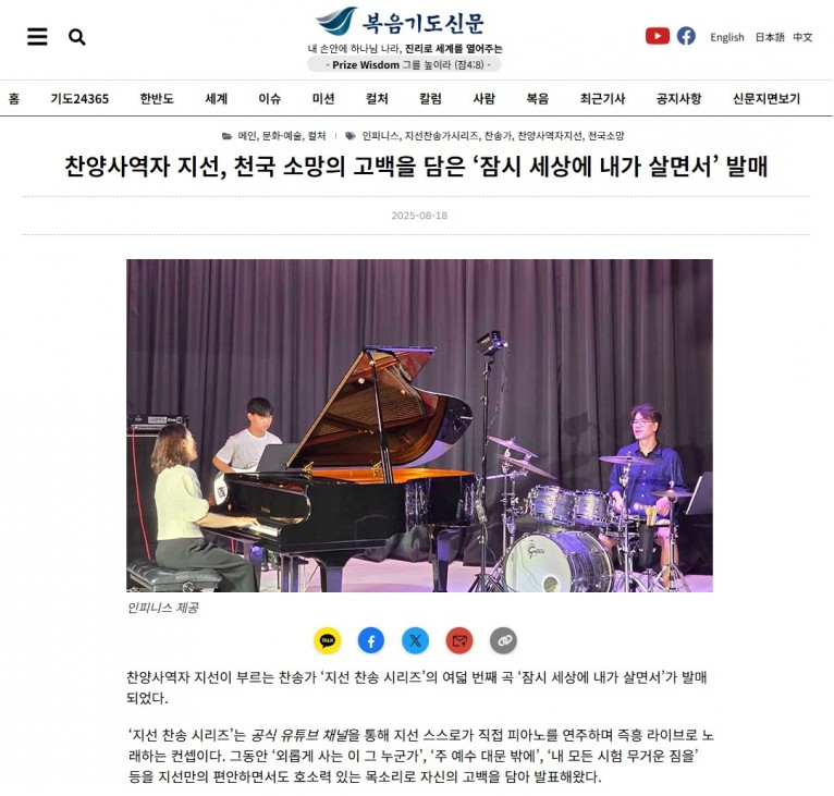 [기사] 찬양사역자 지선, 천국 소망의 고백을 담은 ‘잠시 세상에 내가 살면서’ 발매(복음기도신문)