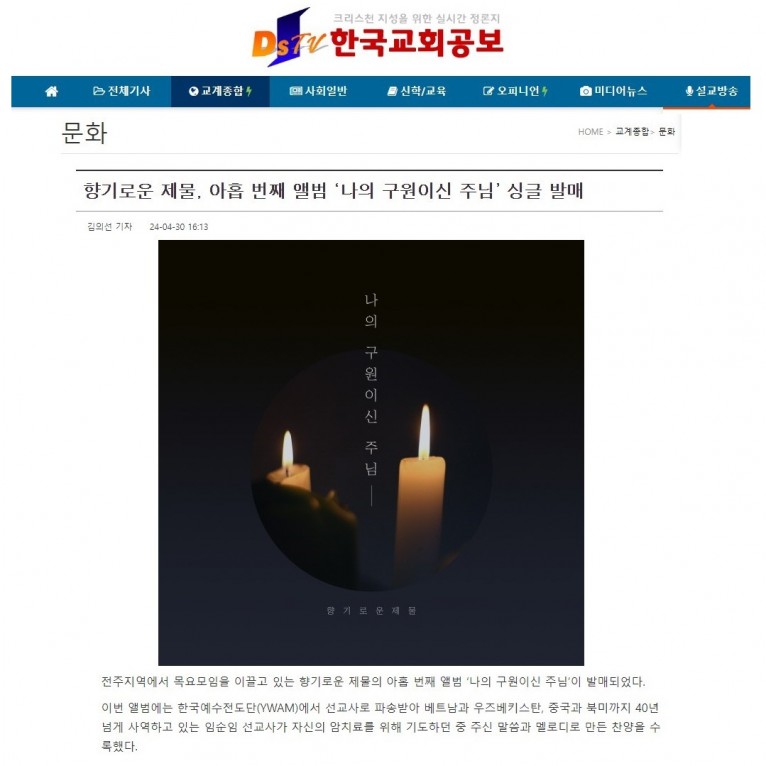 [기사] 향기로운 제물, 아홉 번째 앨범 ‘나의 구원이신 주님’ 싱글 발매(한국교회공보)