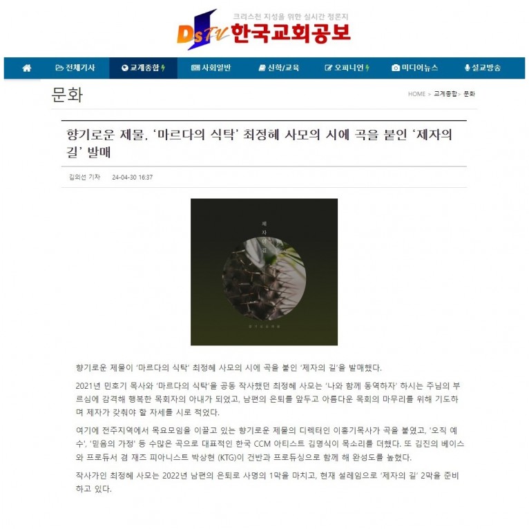 뮤직타임 [기사] 향기로운 제물, ‘마르다의 식탁’ 최정혜 사모의 시에 곡을 붙인 ‘제자의 길’ 발매(한국교회공보)