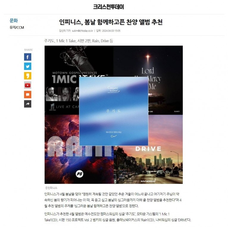 인피니스가 추천한 4월 앨범은 예수전도단 캠퍼스워십의 싱글 ‘주기도’, 모타운 가스펠의 ‘1 Mic 1 Take’(CD), 시편 150 프로젝트 Vol. 2 범키의 싱글 음원, 플래닛쉐이커스의 ‘Rain’(CD), 나비워십의 싱글 ‘DRIVE’다.
