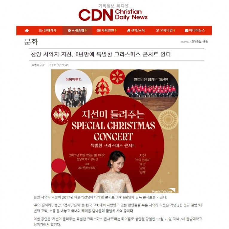 [기사] 찬양 사역자 지선, 6년만에 특별한 크리스마스 콘서트 연다 (기독일보 씨디엔)