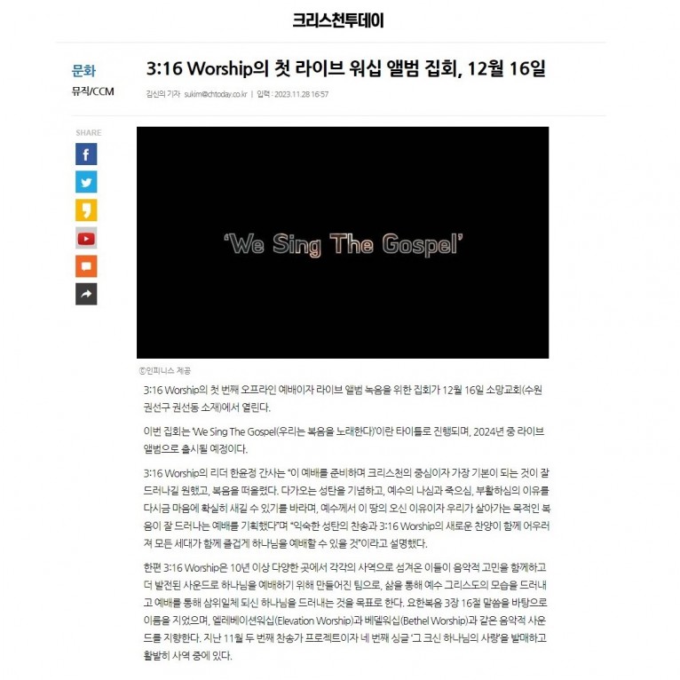 뮤직타임 [기사] 3:16 Worship의 첫 라이브 워십 앨범 집회, 12월 16일(크리스천투데이)