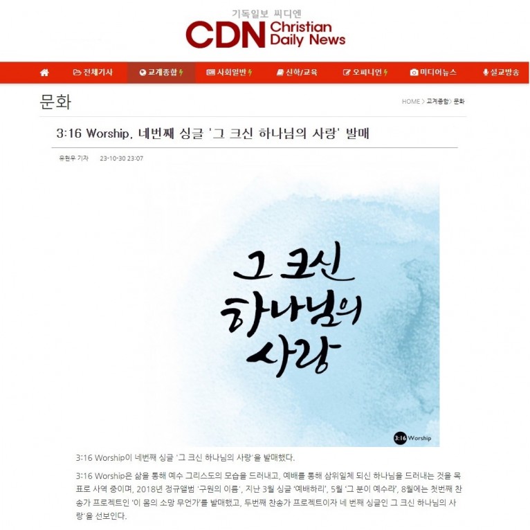 뮤직타임 [기사] 3:16 Worship, 네번째 싱글 '그 크신 하나님의 사랑' 발매(기독일보 씨디엔)