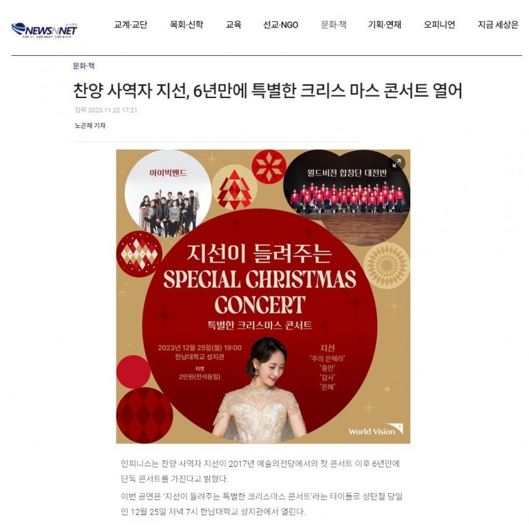 [기사] 찬양 사역자 지선, 6년만에 특별한 크리스마스 콘서트 열어(뉴스앤넷)