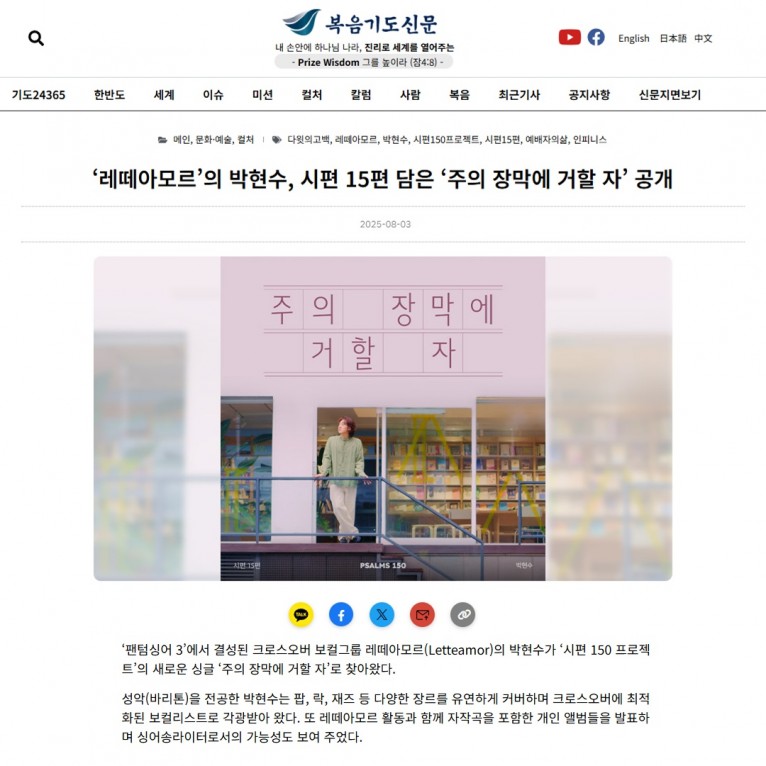 [기사] ‘레떼아모르’의 박현수, 시편 15편 담은 ‘주의 장막에 거할 자’ 공개(복음기도신문)