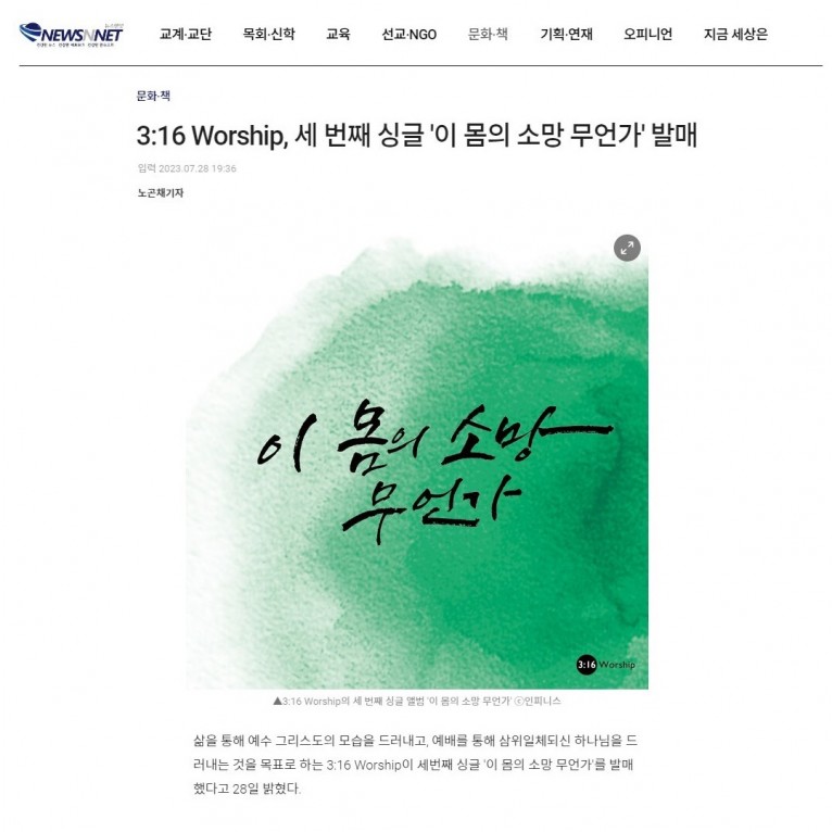 [기사] 3:16 Worship, 세 번째 싱글 '이 몸의 소망 무언가' 발매(뉴스앤넷)