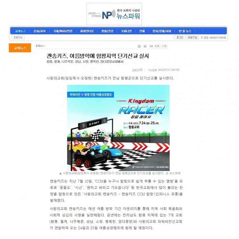 [기사] 캔송키즈, 여름방학에 함평지역 단기선교 실시(뉴스파워)