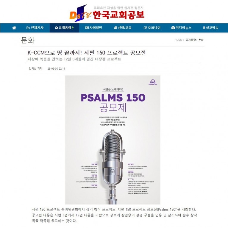 [기사] K-CCM으로 땅 끝까지! 시편 150 프로젝트 공모전(한국교회공보)
