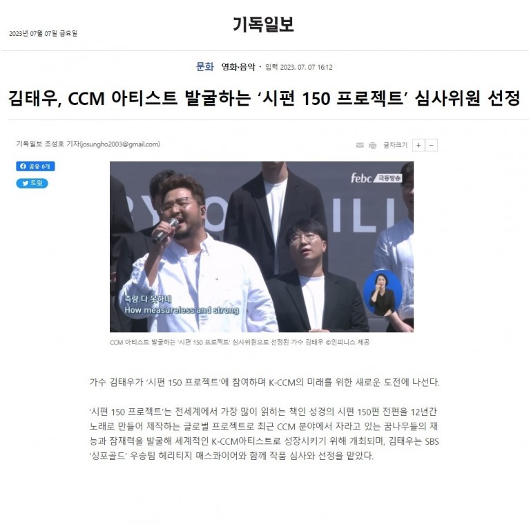 [기사] 김태우, CCM 아티스트 발굴하는 ‘시편 150 프로젝트’ 심사위원 선정 (기독일보)