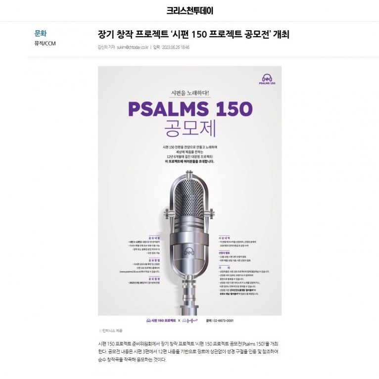 뮤직타임 [기사] 장기 창작 프로젝트 ‘시편 150 프로젝트 공모전’ 개최(크리스천투데이)
