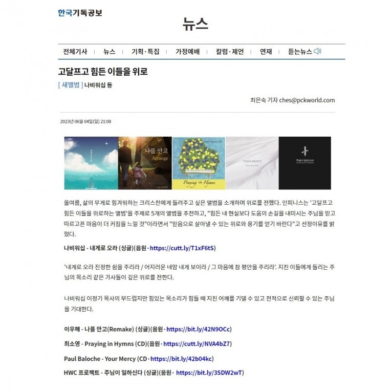 [기사] 고달프고 힘든 이들을 위로하는 앨범 추천(한국기독공보)